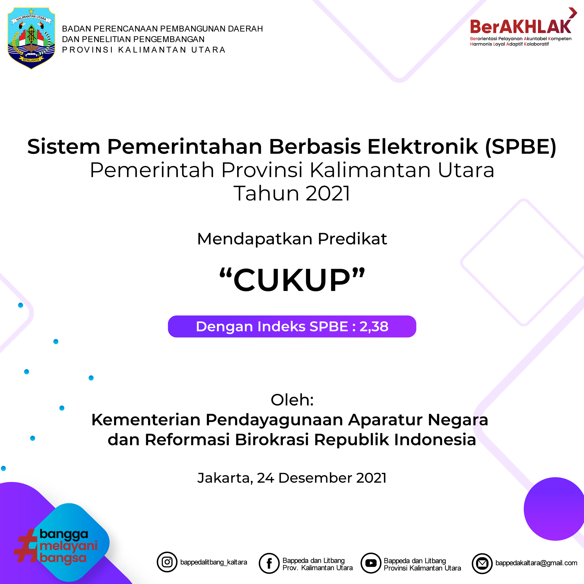Pemerintah Provinsi Kalimantan Utara mendapatkan predikat "Cukup" dengan perolehan indeks sebesar 2,38. Nilai indeks penerapan SPBE dikelompokkan menjadi empat kategori predikat, antara lain: Memuaskan (4,2 - 5,0), Sangat Baik (3,5 - <4,2), Baik (2,6 - <3,5), Cukup (1,8 - <2,6) dan Kurang (<1,8).