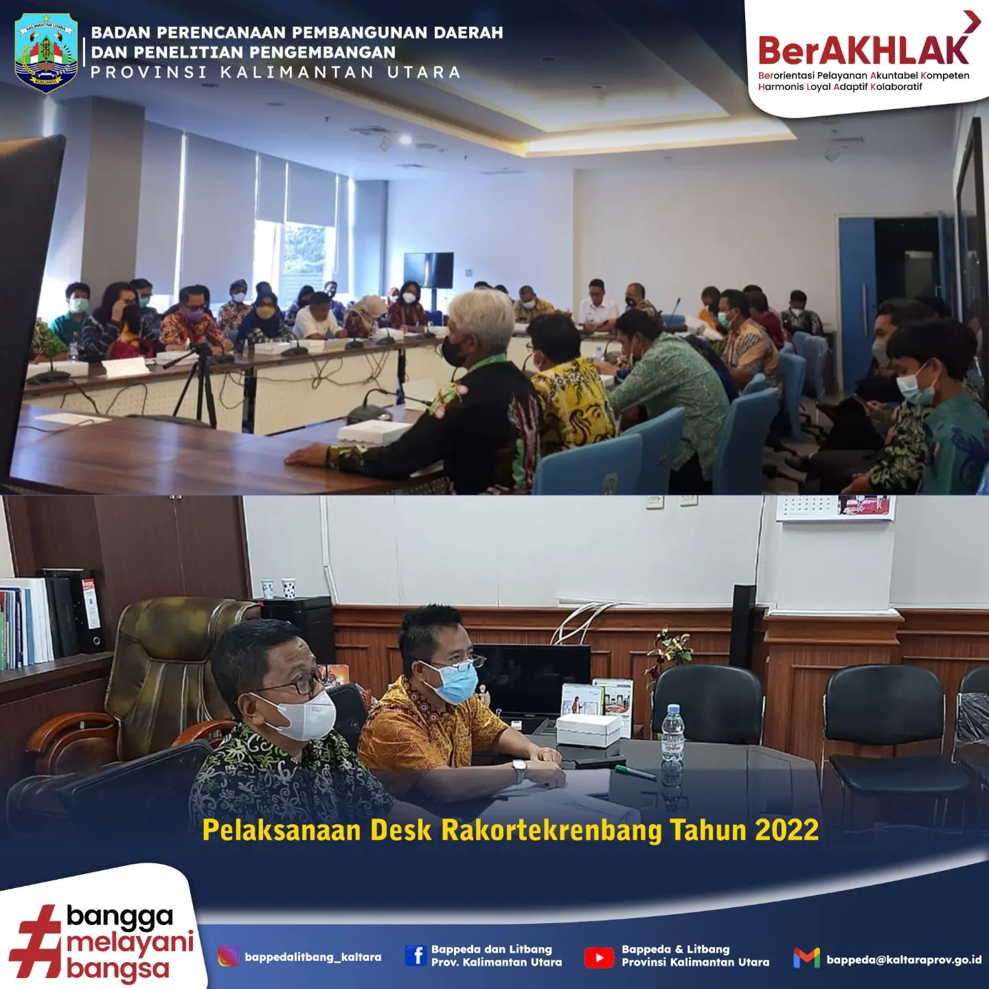 Tanjung Selor - Menindaklanjuti surat dari Deputi Bidang Pengembangan Regional, Kementerian PPN/Bappenas Nomor 01940/PP.06.01/D.II/T/11/2021 tanggal 15 Februari 2022 lalu perihal Undangan Desk Kewilayahan Rapat Koordinasi Teknis Perencanaan Pembangunan (Rakortekrenbang) Tahun 2022, Bappeda dan Litbang bersama seluruh Perangkat Daerah lingkup Pemprov. Kaltara mengikuti Pelaksanaan Desk Rakortekrenbang Tahun 2022 secara daring pada Jumat (25/02/2022). Dalam hal ini Bappeda dan Litbang mendampingi Perangkat Daerah sesuai dengan urusan kewenangan masing-masing.