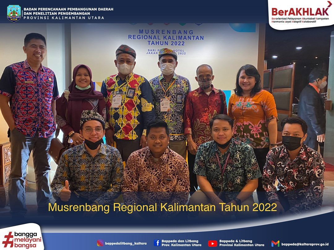 Jakarta - Perwakilan Bappeda dan Litbang Prov. Kalimantan Utara mengikuti kegiatan Musyawarah Rencana Pembangunan (Musrenbang) Regional Kalimantan Tahun 2022. Peserta kegiatan ini adalah Menteri teknis, Kepala Daerah di Kalimantan, Ketua dan Wakil Ketua Komisi V DPR RI, Ketua dan Wakil Ketua Komisi II DPRD Prov. Kalimantan Selatan, Sekretaris Daerah Provinsi se Kalimantan, Kepala Bappeda dan Litbang Provinsi se Kalimantan. Tema kegiatan Musrenbang Regional Kalimantan Tahun 2022 ini adalah Percepatan Pembangunan Regional Kalimantan dalam Membangun Ibu Kota Negara Nusantara. Maksud penyelenggaraan kegiatan ini adalah sebagai wadah pertemuan para pihak untuk penyelenggaraan Pemerintah Daerah Provinsi, Kabupaten/Kota, dengan K/L yang beraitan dengan fokus usulan pembangunan di regional Kalimantan.