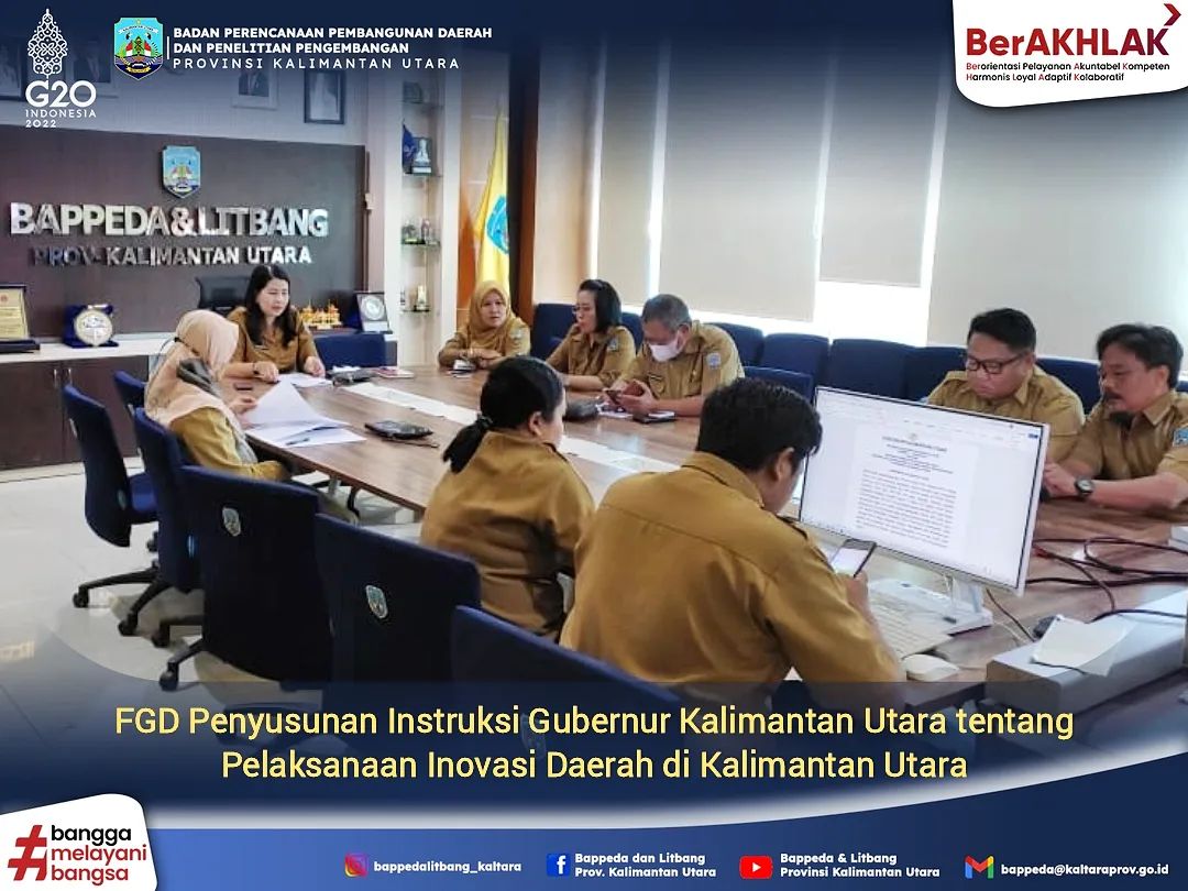 Tanjung Selor - Bertempat di Ruang Rapat Gunung Putih Kantor Bappeda dan Litbang, Kabid Penelitian dan Pengembangan memimpin kegiatan FGD Penyusunan Instruksi Gubernur Kalimantan Utara tentang Pelaksanaan Inovasi Daerah di Provinsi Kalimantan Utara, Senin (13/06/2022). FGD ini dihadiri oleh Kepala Bidang dan Perencana Ahli Muda lingkup Bappeda dan Litbang serta perwakilan dari Biro Organisasi.