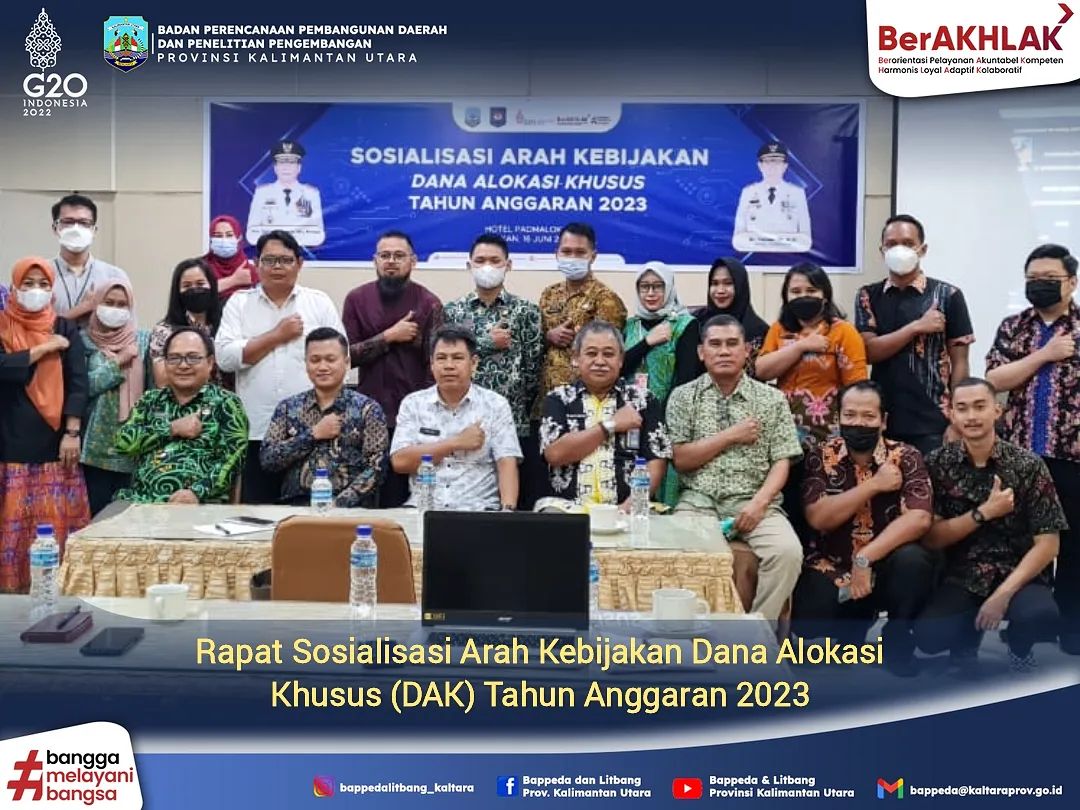 Tanjung Selor - Pemerintah Provinsi Kalimantan Utara melalui Bappeda dan Litbang Provinsi Kalimantan Utara menyelenggarakan Rapat Sosialisasi Arah Kebijakan Dana Alokasi Khusus (DAK) T.A. 2023 di Ruang Rapat Hotel Padmaloka Tarakan pada Kamis (16/06/2022). Kegiatan tersebut dibuka oleh Plt. Kepala Bappeda dan Litbang, Ir. Helmi. Perwakilan Kementerian Dalam Negeri menjadi narasumber dengan materi Pengelolaan Kebijakan Dana Alokasi Khusus (DAK) yang disampaikan oleh Drs. Palimbong Pongtuluran, Tenaga Ahli Direktorat Jenderal Bina Pembangunan Daerah Kementerian Dalam Negeri. Selain itu, Kementerian PPN/Bappenas juga menyampaikan materi seputar Arah Kebijakan Dana Alokasi Khusus (DAK) T.A. 2023.