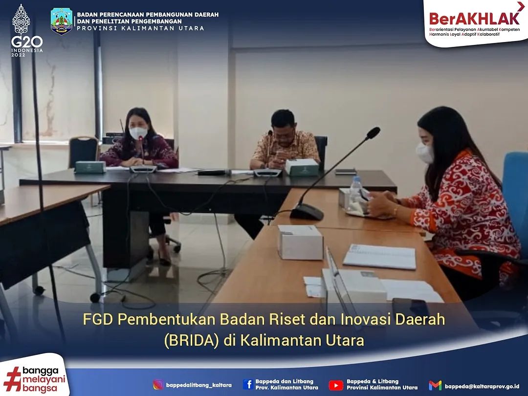 Tanjung Selor - Jumat, 8 Juli 2022, Pemerintah Provinsi Kalimantan Utara menyelenggarakan FGD Pembentukan Badan Riset dan Inovasi Daerah (BRIDA) di Kalimantan Utara. FGD ini dilaksanakan sebagai respons terhadap terbitnya Peraturan Presiden RI Nomor 78 Tahun 2021 tentang Badan Riset dan Inovasi Nasional yang berimplikasi pada terbentuknya BRIDA. BRIDA bertugas melaksanakan koordinasi, sinkronisasi, pengendalian penelitian, pengembangan, pengkajian, penerapan serta invensi dan inovasi di lingkup Pemerintah Daerah. FGD yang dilaksanakan di Ruang Rapat Kantor Gubernur Lantai 2 ini dipimpin oleh Asisten Administrasi Umum serta dihadiri oleh Bappeda dan Litbang, Inspektorat, Biro Organisasi, dan Biro Hukum.