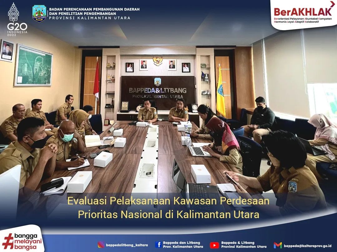 Tanjung Selor - Bappeda dan Litbang selaku Sekretariat Kawasan Perdesaan Prioritas Nasional (KPPN) Provinsi Kalimantan Utara mengadakan Rapat Evaluasi Pelaksanaan KPPN secara luring di Ruang Rapat Gunung Putih. Rapat ini diadakan bersama dengan beberapa Perangkat Daerah lingkup Pemprov. Kalimantan Utara beserta Perangkat Daerah lingkup Kabupaten Bulungan dan Nunukan selaku daerah yang ditetapkan sebagai Kawasan Perdesaan Prioritas Nasional sesuai amanat Peraturan Presiden Nomor 18 Tahun 2020 tentang Rencana Pembangunan Jangka Menengah Nasional Tahun 2020-2024 dan Rencana Pembangunan Jangka Menengah Daerah 2021-2026.